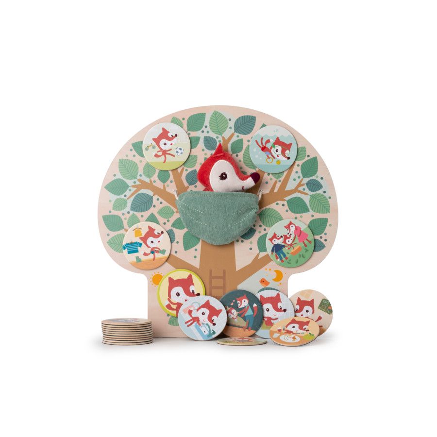 Composé de 21 petites cartes rondes magnétiques illustrant diverses scènes du quotidien, ce panneau permet aux enfants d'exprimer leurs émotions tout en développant leurs compétences narratives. Au cœur de cette aventure se trouve Alice la renarde, un mini personnage qui dort paisiblement dans son hamac ou accompagne l'enfant dans son récit.