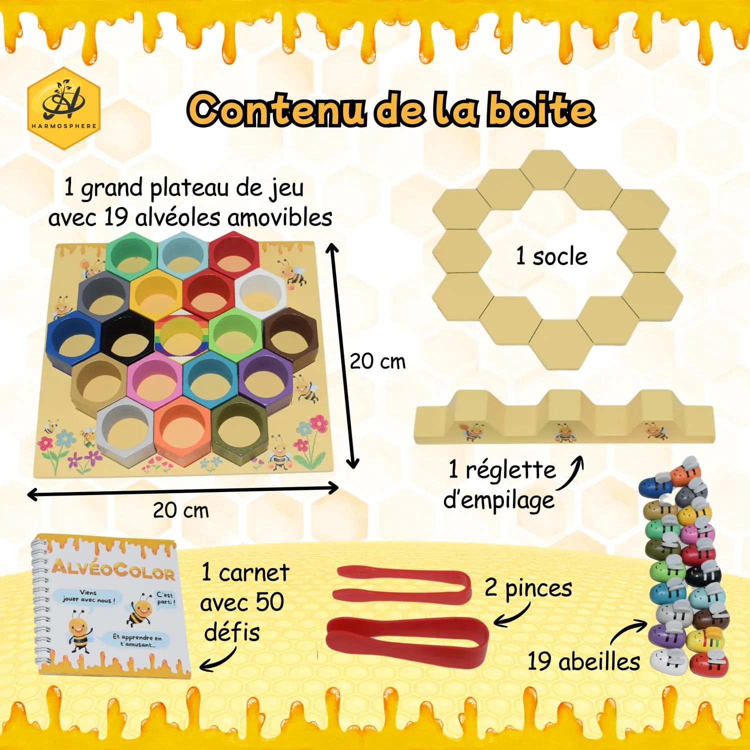 - Matériel complet : 1 plateau de jeu, 1 réglette d'empilage, 19 alvéoles amovibles, 19 abeilles, 2 minces de préhension, 1 carnet de défis
