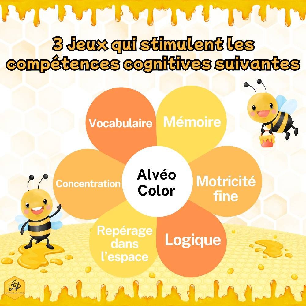 Il s'agit d'un jouet évolutif 3-en-1 qui aide les enfants à développer la motricité fine, le tri des couleurs, la construction, la logique et la mémoire. Il comprend des tâches comme recréer des modèles en 3D et replacer les abeilles dans les alvéoles de leur couleur respective.