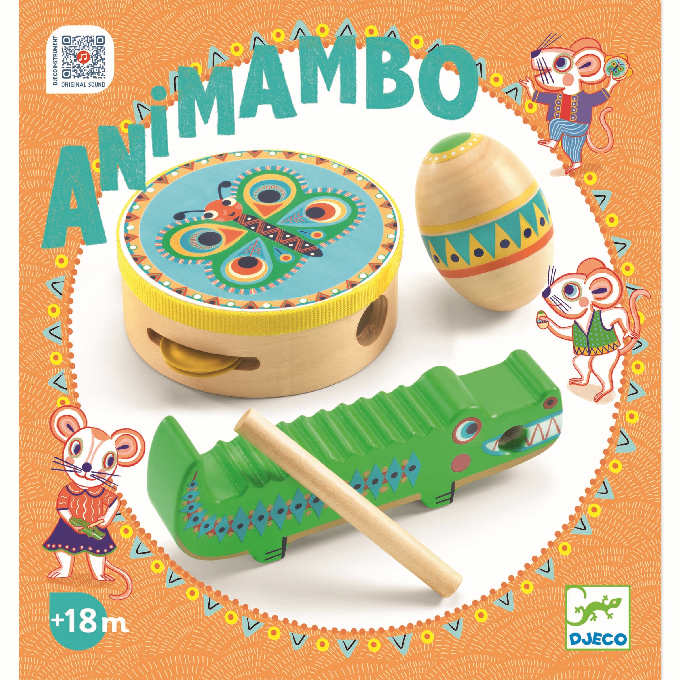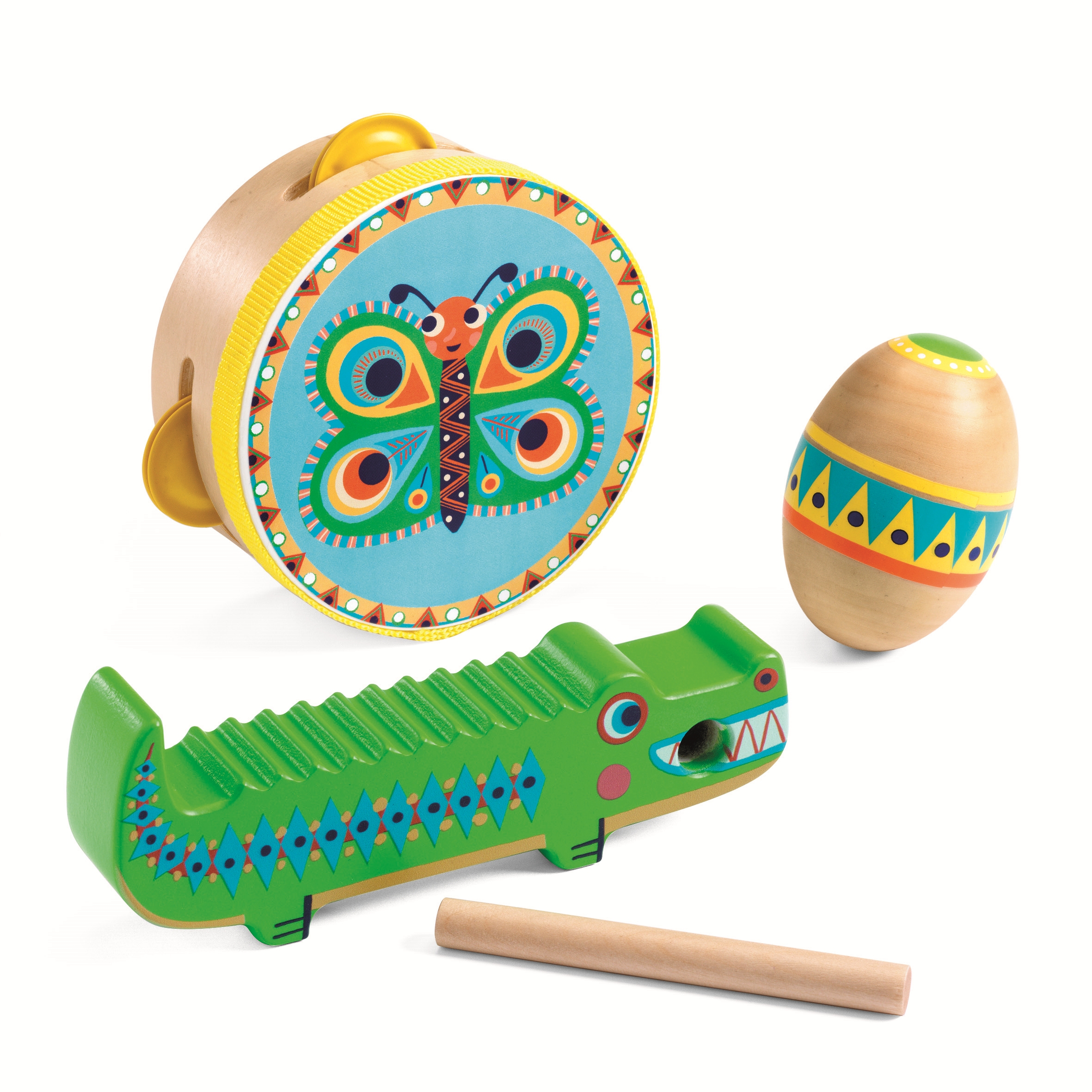 Ce set de percussions en bois fait partie de la collection Animambo de Djeco. Il est composé d'un tambourin papillon, d'une maracas œuf et d'un güiro crocodile. Cet ensemble d'instruments parfaitement adaptés aux tout-petits est le cadeau idéal pour éveiller votre enfant à la musique, développer son sens du rythme et améliorer sa motricité.