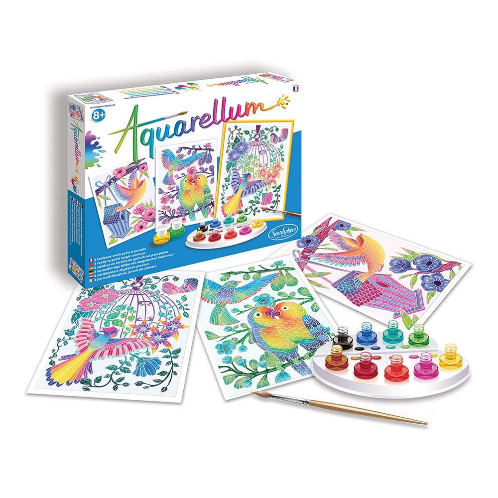 Aquarellum est basé sur la technique de sertissage de papier vélin qui ne laisse la peinture aquarelle adhérer que sur les surfaces réservées : le motif apparaît au fur et à mesure du passage du pinceau et peut-être repeint jusqu'à obtention de l'harmonie parfaite !