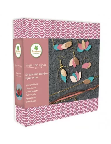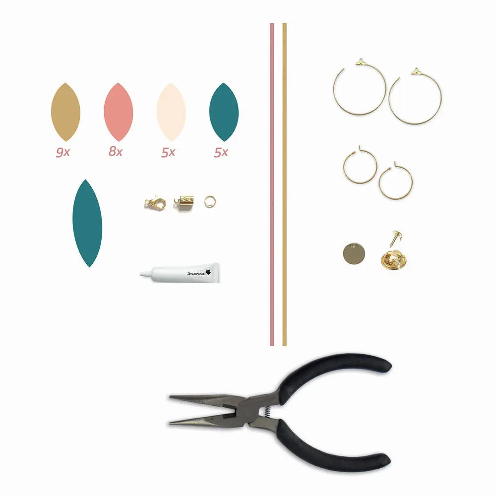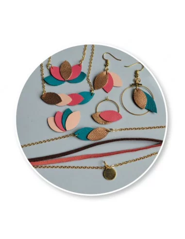 Contenu : pièces de cuir aux couleurs variées, fermoirs, chaîne, anneaux, boucles d’oreille, colle pour bijoux, pince à bijoux et 1 et une notice explicative.