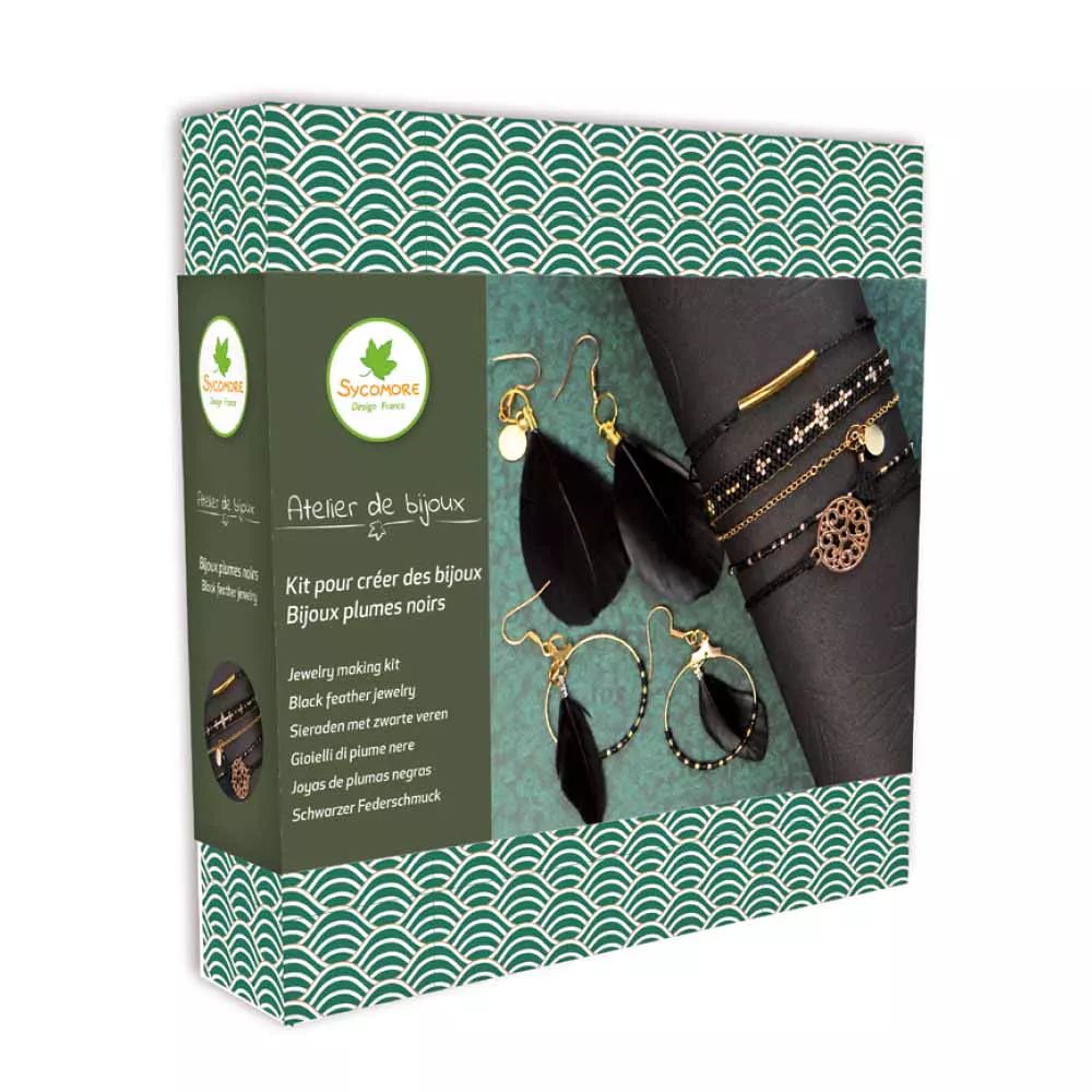 Contenu : deux anneaux, une chaîne, des pendentifs plaqués or, des perles japonaises (noires, dorées et gris acier), une aiguille, une pince coupante, des fermoirs, du fil, des pompons, un tube plaqué or, plumes et un livret d'instructions avec plusieurs modèles.