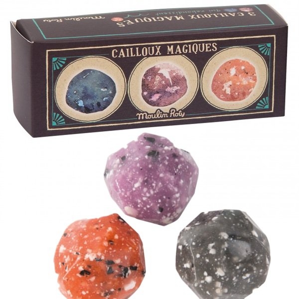 Découvrez les balles rebondissantes cailloux magiques de la collection Les petites merveilles de Moulin Roty, 3 balles en caoutchouc de couleur rose, gris et orange qui font penser à des pierres précieuses. De fausses pierres que vos enfant auront plaisir à lancer pour les voir rebondir dans tous les sens grâce à leurs angles sur toutes les côtés.