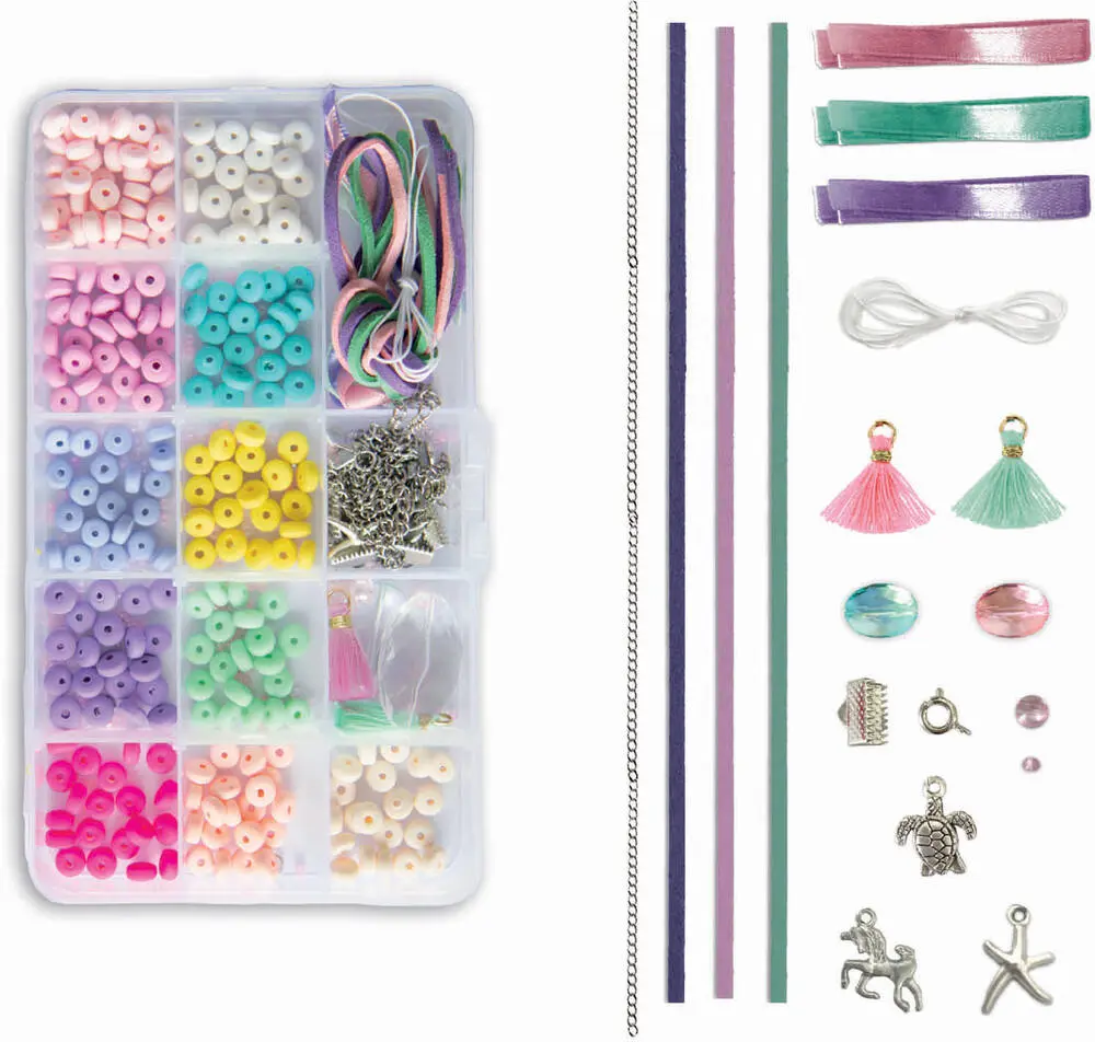 Contenu : des perles de différentes couleurs, du fil, des rubans, une chaîne, des fermoirs, des charms, des breloques... une pince et une notice dans une magnifique boite illustrée à fermeture magnétique.