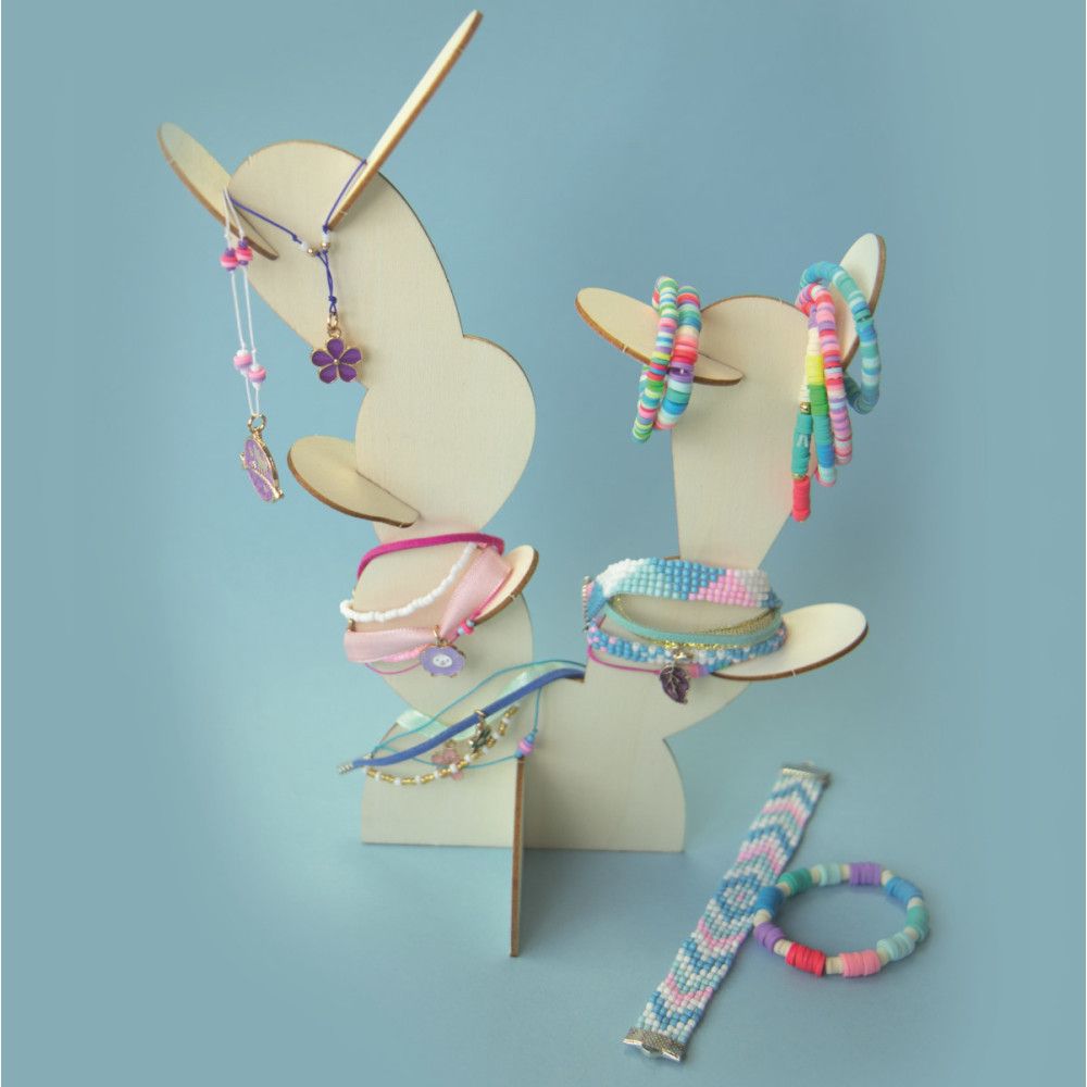 - Contenu : métier à tisser en bois et métal, un présentoir à bijoux en bois à monter, des perles de rocaille, des perles heishi, des charms, une boîte à compartiments pour ranger les perles, une pince, du fil nylon et des fils coton