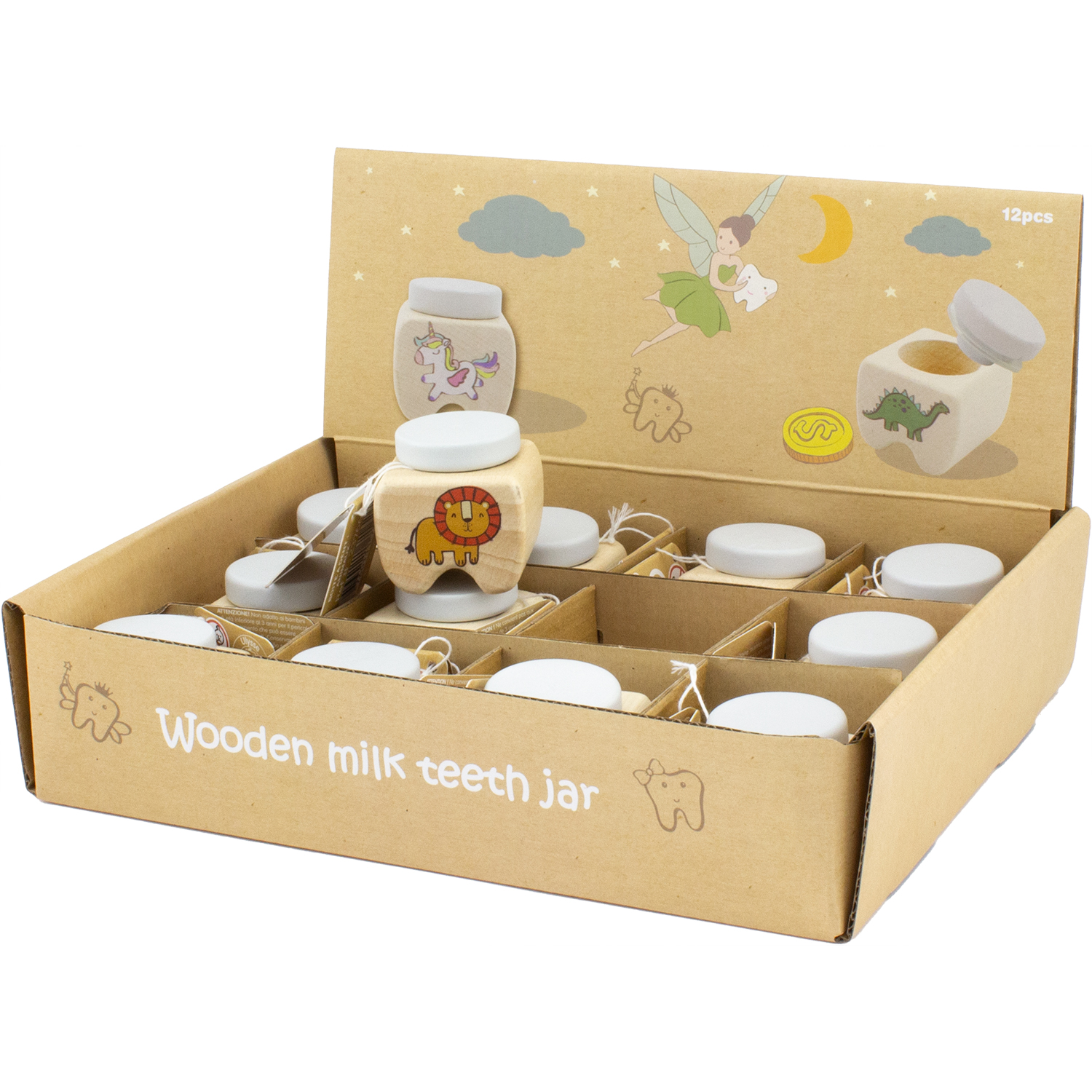 Découvrez notre boîte à dents en bois en forme de dent (bois certifié et peinture à l'eau), parfaite pour les enfants lorsqu'ils perdent leurs dents de lait.