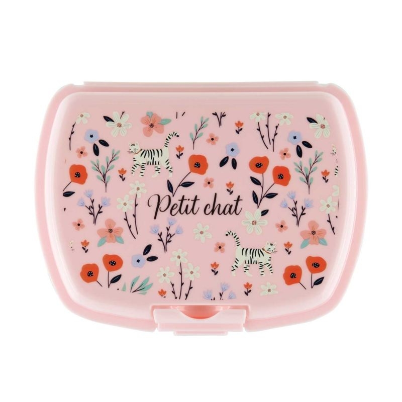 Une jolie boîte à goûter de la marque Derrière la porte aux motifs floraux agrémentés de petits chats zébrés.