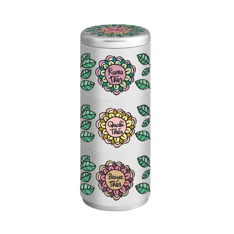 Trois boîtes de rangement empilables en métal de la marque Derrière la porte pour stocker et présenter ses différents thés.