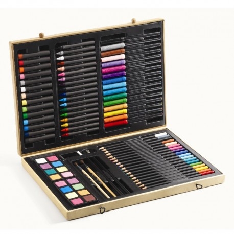 Cette mallette compacte à emporter partout contient tout le matériel nécessaire pour colorier, peindre et dessiner.