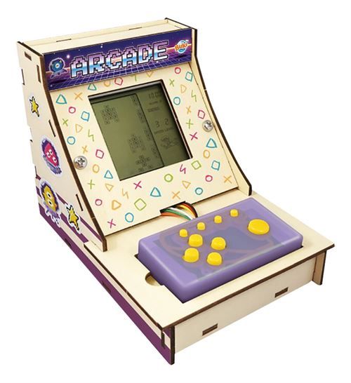 12 jeux inspirés de grands classiques de l’arcade : jeu de puzzle, snake, casse-briques, shoot’em up… Avec le tournevis inclus, il assemble la manette, construit la borne et branche ensemble les composants : écran, haut-parleur et alimentation. Il peut même personnaliser sa borne avec les autocollants.