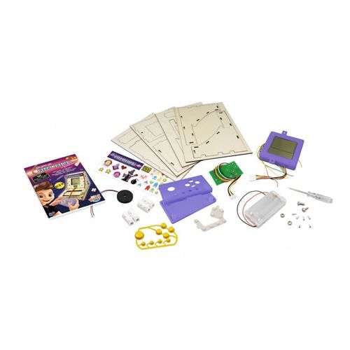 - Contenu : 4 planches de bois, écran, manette, coque supérieure, coque inférieure, circuit imprimé, boutons, tampon conducteur, haut-parleur, adhésif double-face, compartiment à piles, 2 connecteurs blancs, 2 vis longues, 2 écrous, 2 vis moyennes, 4 petites vis, 2 tournevis et planche d’autocollants.