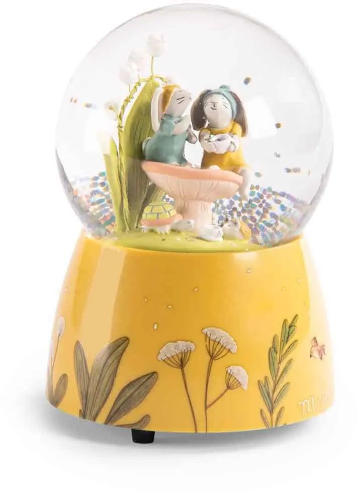 La boule à neige musicale de la collection Trois petits lapins de Moulin Roty, un élément de décoration poétique pour apporter un peu de magie aux tout-petits.