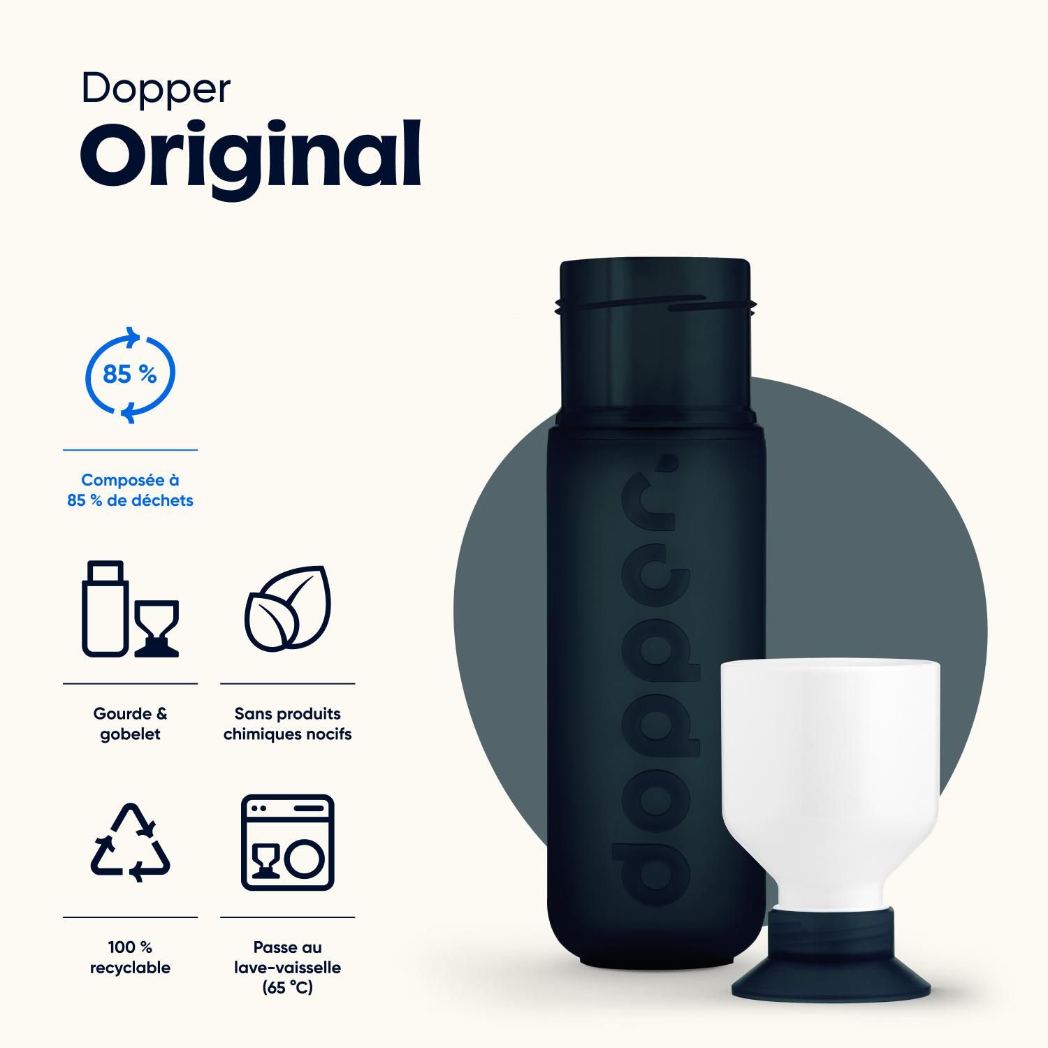 - Une empreinte carbone nulle : grâce à 85 % de matériaux recyclés et à une usine basée aux Pays-Bas qui tourne à 100 % à partir d'énergie renouvelable, la Dopper Original se démarque par sa neutralité carbone