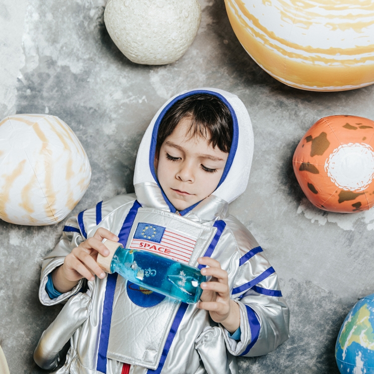 Ici, une activité d'éveil avec une bouteille flottante autour de la couleur bleue, contenant du liquide et un astronaute, une planète, une fusée...