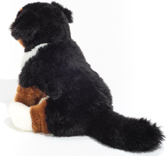 Ce chien en peluche est un adorable Bouvier Bernois de 29 cm de la marque Teddy Hermann. Son pelage est fait de fines fourrures tissées dans des tons noir, brun et blanc. Il a de jolis yeux transparents noirs au pourtour ambré qui lui donnent un regard déterminé. Le bout de ses pattes, son plastron et son museau tout blancs contrastent joliment avec l'ensemble.
