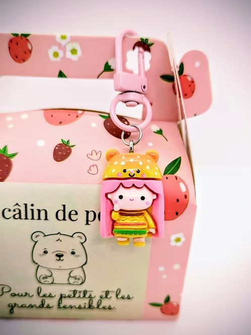 Le Concept : Un lien rassurant entre la maison et l'extérieur. L'enfant garde la carte illustrée dans sa chambre et emmène son petit personnage porte-clé partout avec lui, comme un repère familier.