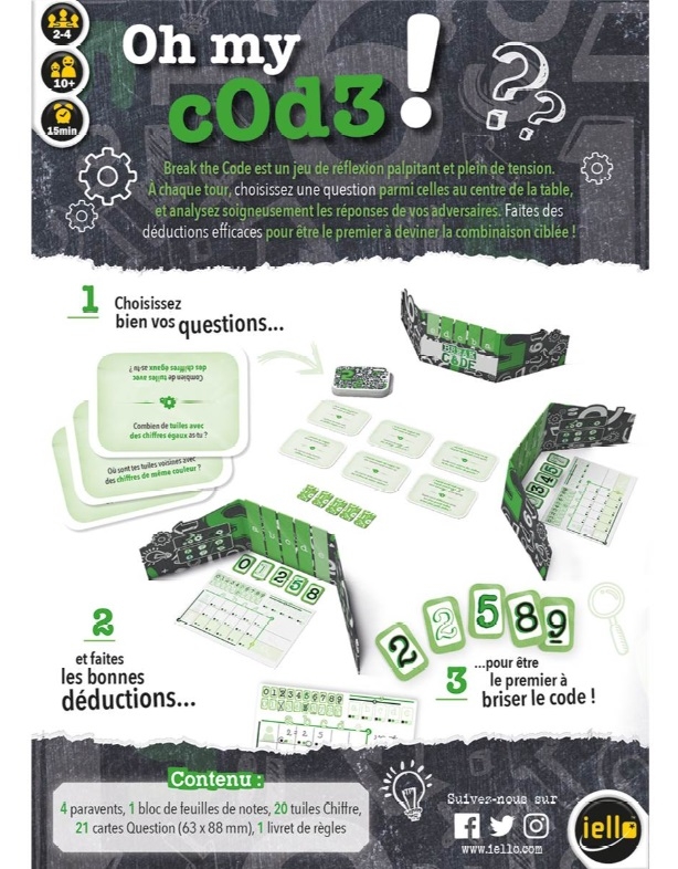 A 3 ou 4 joueurs, vous devez être le premier à identifier le code caché au centre de la table. Il faudra donc trouver le code de chaque adversaire afin de pouvoir en déduire celui qui est dissimulé de tous !