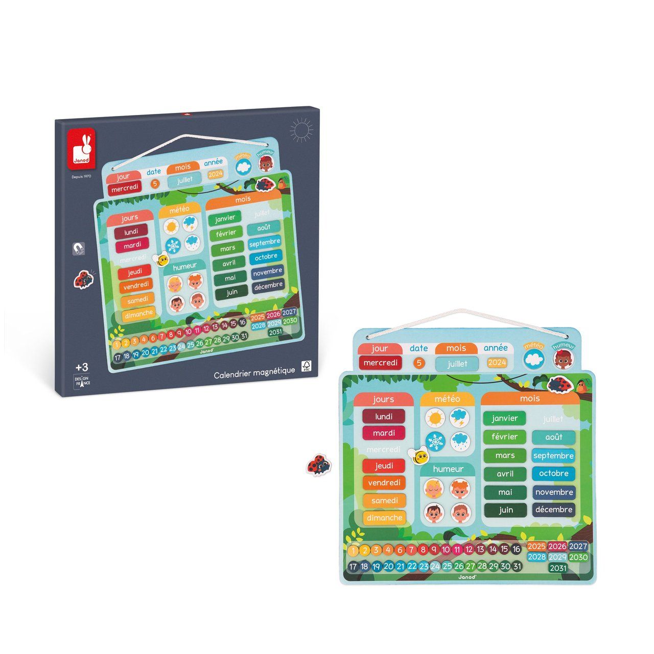 Une nouvelle journée commence, quel jour sommes-nous ? Quel temps fait-il ? Chaque jour, votre enfant prendra plaisir à renseigner le jour, la date, le mois, la météo et son humeur avec ce calendrier magnétique à suspendre aux couleurs joyeuses.