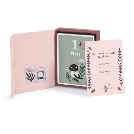 Découvrez les cartes Mes 12 premiers mois de la collection Après la pluie de Moulin Roty, un coffret de 30 cartes pour prendre en photo bébé, et retracer les grandes étapes de ses 12 premiers mois. Sur chacune d'elle, un côté thématique illustré des adorables animaux de la collection et l'autre pour coller la photo et y inscrire quelques souvenirs.