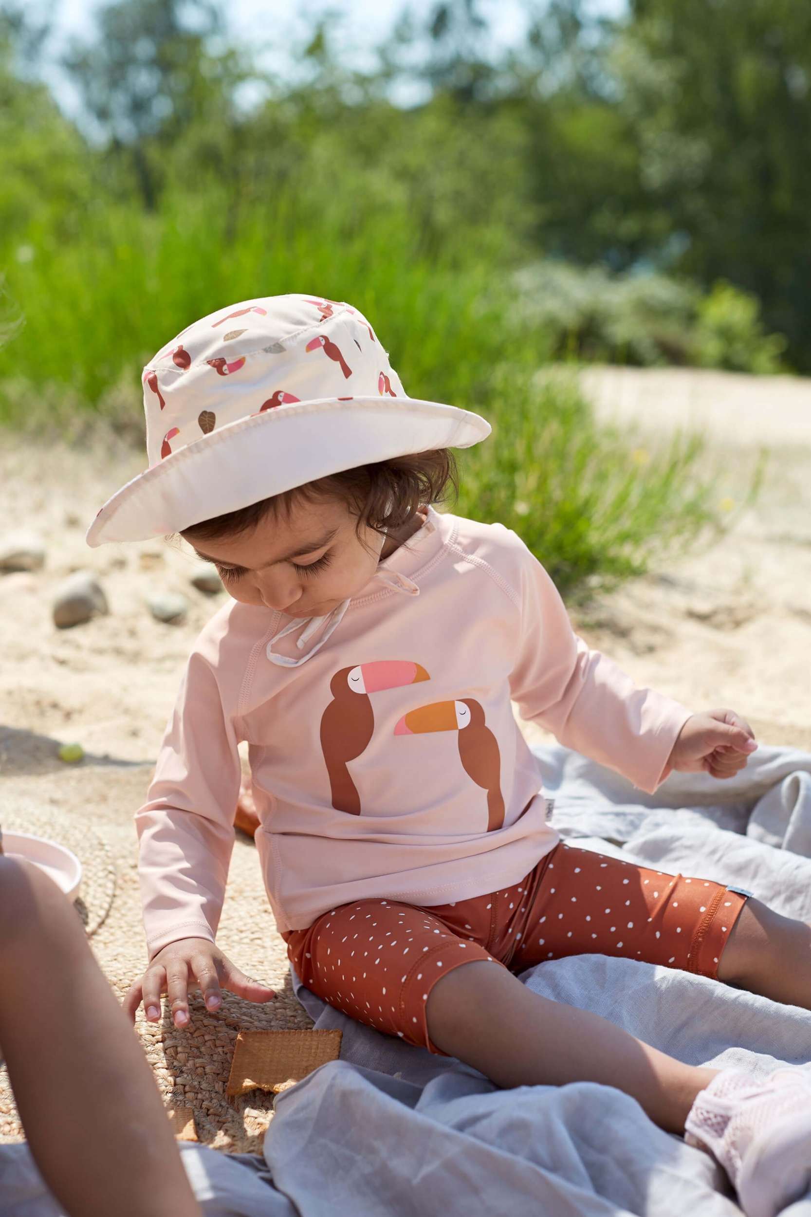Le chapeau anti-UV LÄSSIG, en polyester recyclé, et réversible, est parfait pour les journées d'été avec ses imprimés fantaisie. Avec un indice de protection UV de 80, il protège la tête sensible des petits en été.