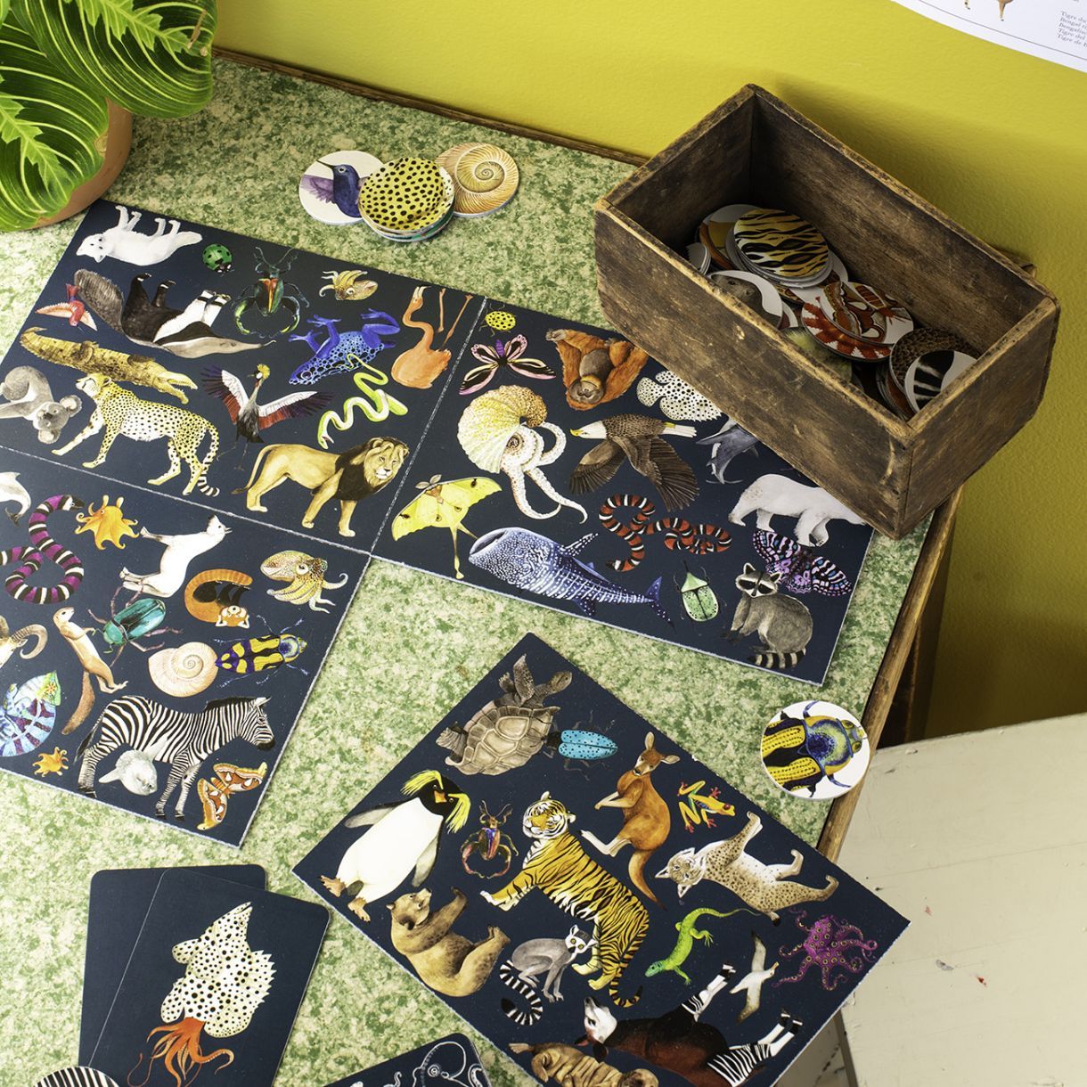 Pour pimenter le jeu et gagner plus de points, piochez une carte curiosité. A chaque partie, changez le plateau de jeu en modulant les 9 planches. Un poster avec le nom des animaux est inclus.