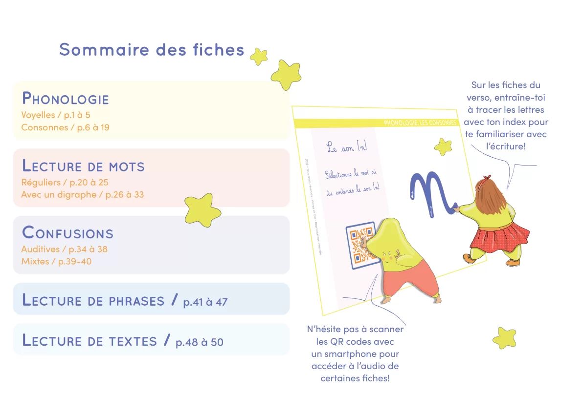 Il propose 50 fiches d'exercices ciblant le développement de la conscience phonologique au niveau des sons, des mots et des phrases. Des QR-codes renvoient à une version audio des fiches pour une plus grande autonomie. Il contient également des lettres cursives à tracer avec le doigt pour s'imprégner du bon sens d'écriture.