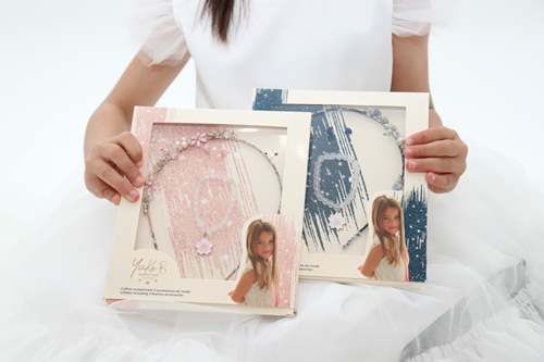 Ce set comprend 3 accessoires haut de gamme pour enfants ; un serre-tête féerique orné de perles et bijoux scintillants, montés sur un joli tissu liberty bleu ; un bracelet de perles et des boucles d'oreilles en céramique.