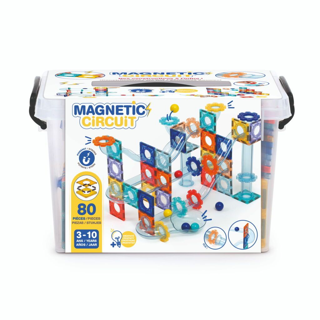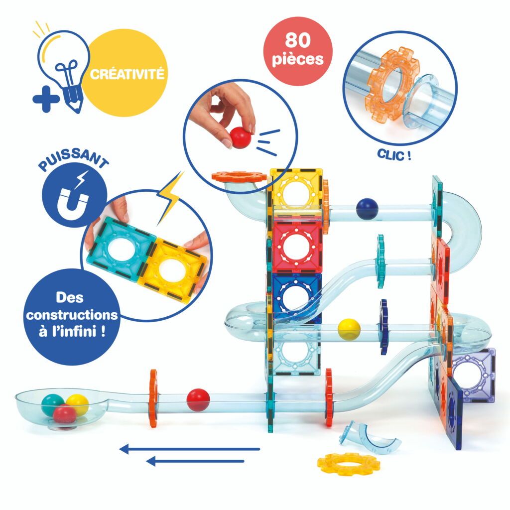 Circuit à billes magnétique avec plaques aimantées, pièces de parcours et billes pour créer des constructions en 2D et 3D.