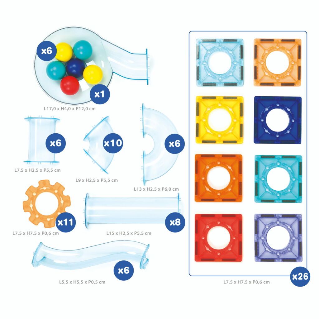 - Contenu : 26 plaques aimantées, 48 pièces de parcours, 6 billes