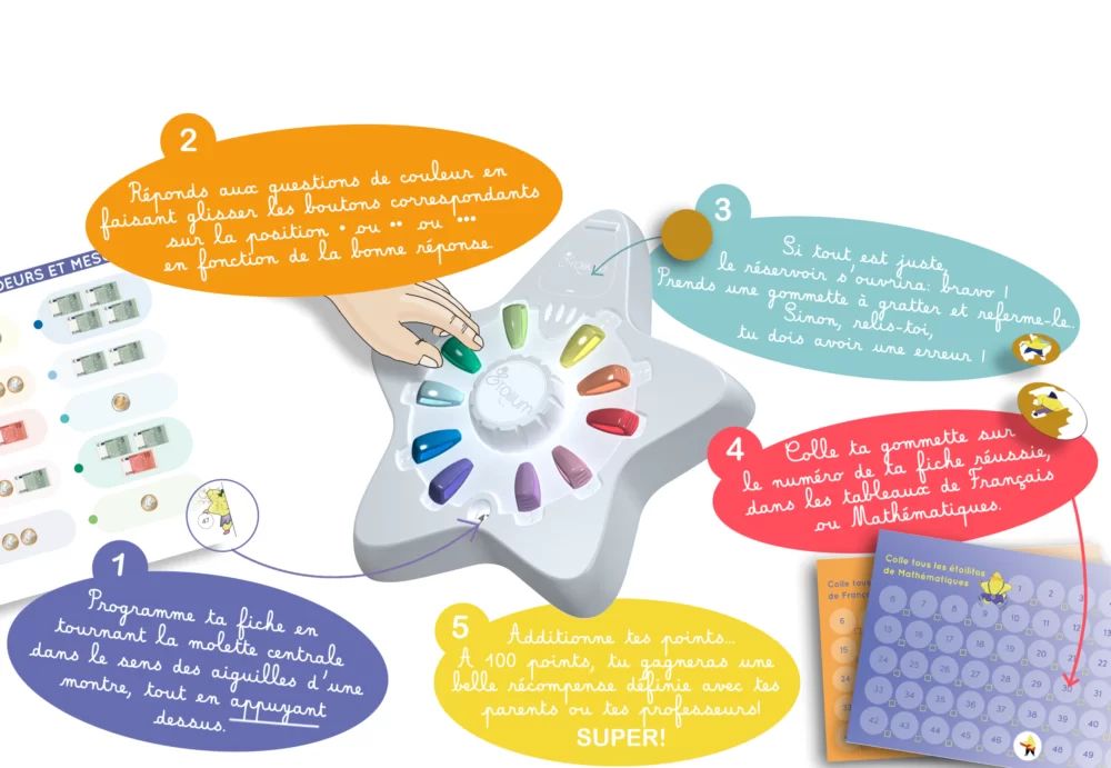 L'Etoilium est un jeu pédagogique complétement magique et entièrement mécanique, sans pile, sans onde et sans écran conçu pour les enfants de la 3e maternelle à la 5e primaire.