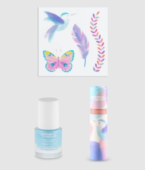 Ce joli coffret Colibri vous embarque dans son univers givré. Il réunit trois produits essentiels : un vernis bleu givré, un gloss parfumé à la pêche et une planche de tatouages éphémères. Le combo parfait pour vivre dans un vrai conte hivernal.