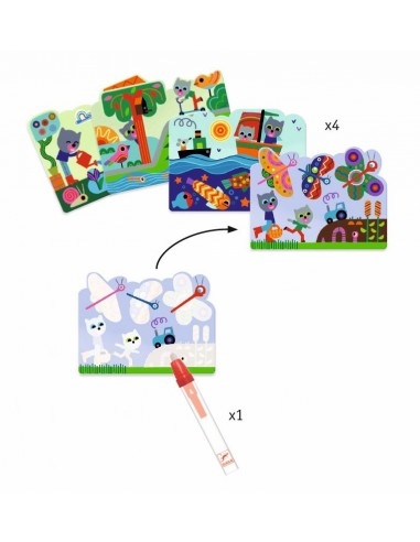 Contenu : 4 planches souples illustrées et un crayon magique