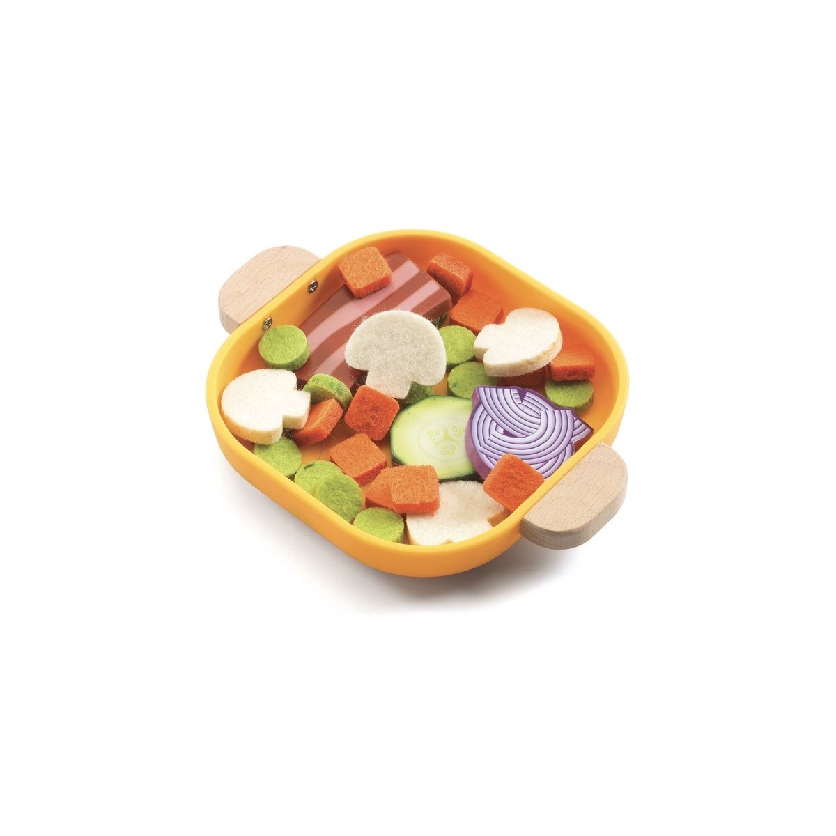 Contenu : 1 poêle avec un fond en velcro, 1 spatule, 1 plat, 6 éléments en bois et en velcro ainsi que 28 pièces en feutrine.