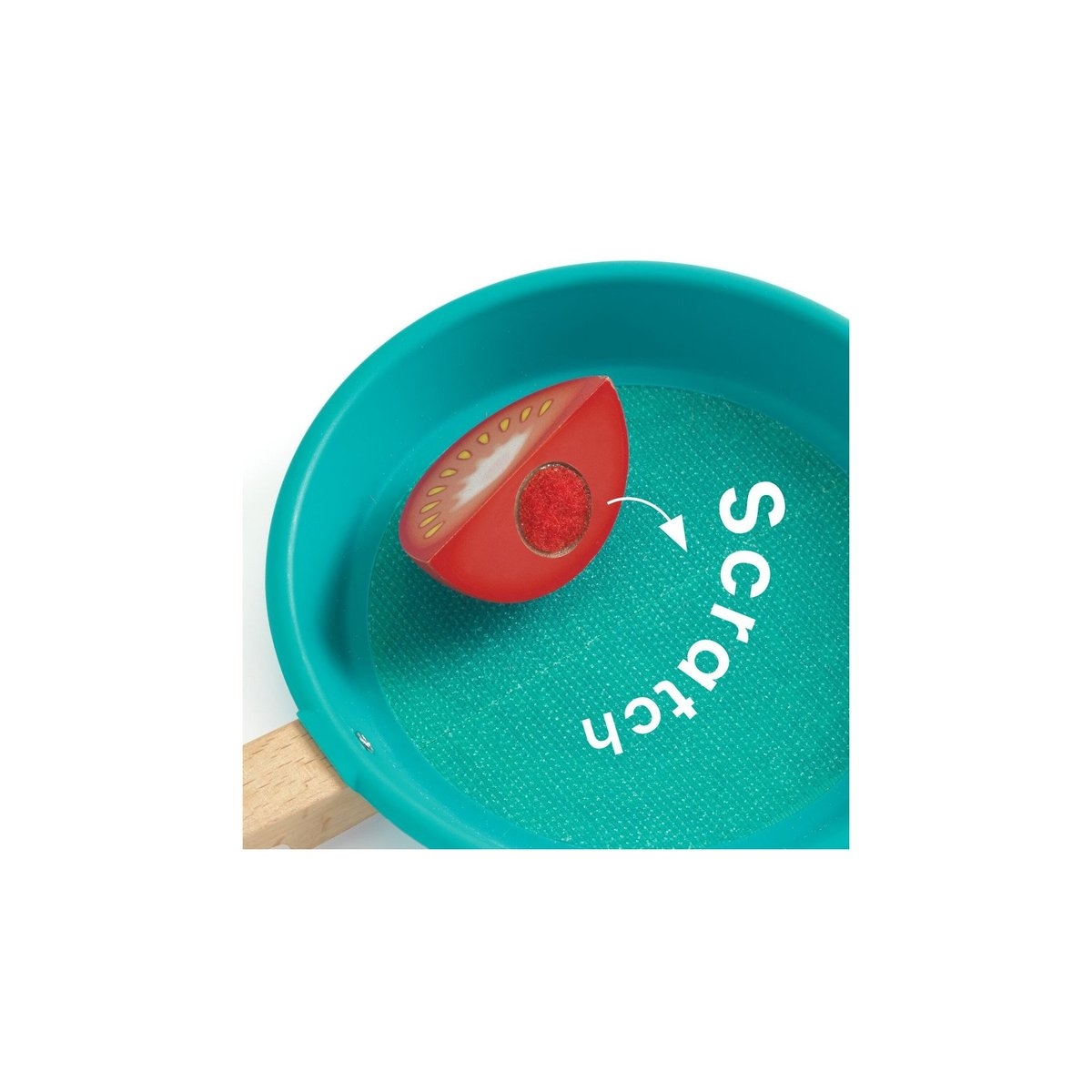 Cook & Scratch est un jeu d'imitation en bois et en feutrine de la marque Djeco grâce auquel l'enfant peut cuire et préparer de succulents plats. Attention à ne pas brûler le repas qui accroche facilement au fond de la poêle !