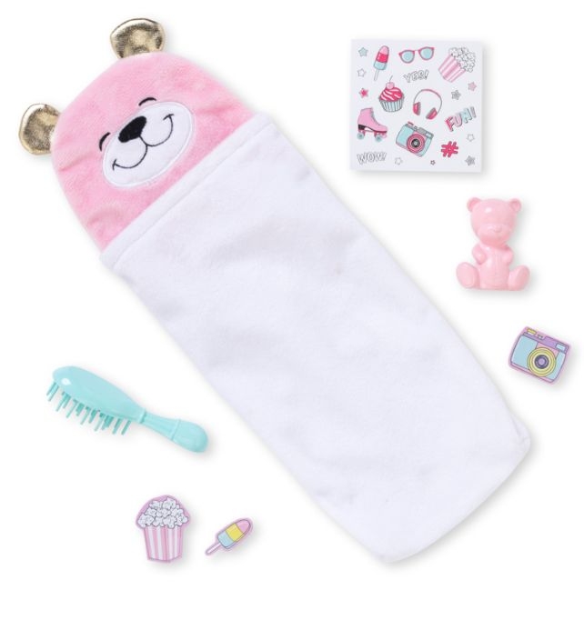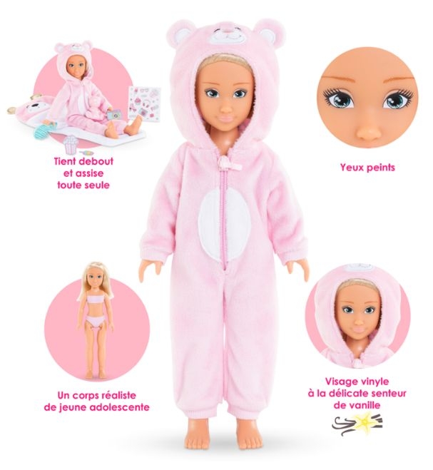 Contenu : une poupée habillée et 7 accessoires : 1 sac de couchage, 1 brosse à cheveux, 1 ourson, 1 planche de stickers et 3 accessoires de jeu en carton