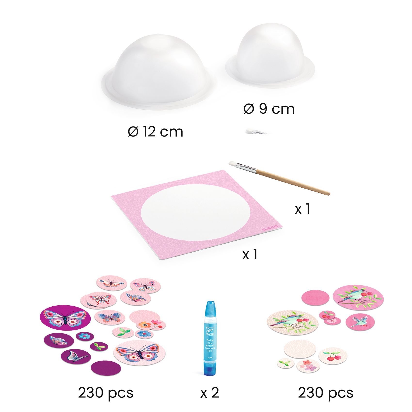 Contenu : 2 coupelles, 2 tubes de colle liquide, 1 palette, 1 pinceau brosse, de grands confettis illustrés en papier, 1 feuillet de pas-à-pas détaillé