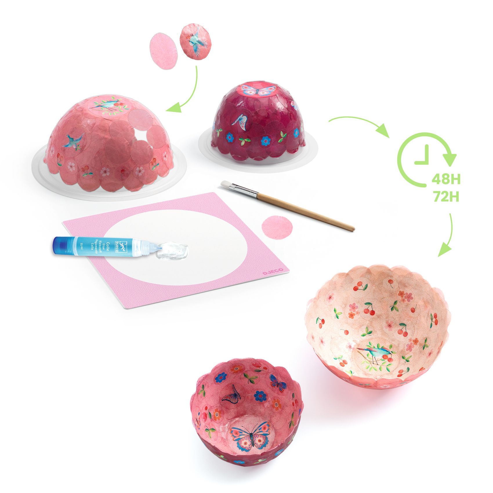 Un kit créatif complet de chez Djeco pour fabriquer 2 coupelles décoratives en papier en utilisant uniquement du papier et de la colle. Il suffit de coller les grands confettis sur les moules à l'aide de la colle liquide, d'abord à l'intérieur, puis à l'extérieur de la coupelle, de les laisser sécher, puis de les démouler. Quelle fierté d'utiliser ses deux ravissants vide-poches assortis !