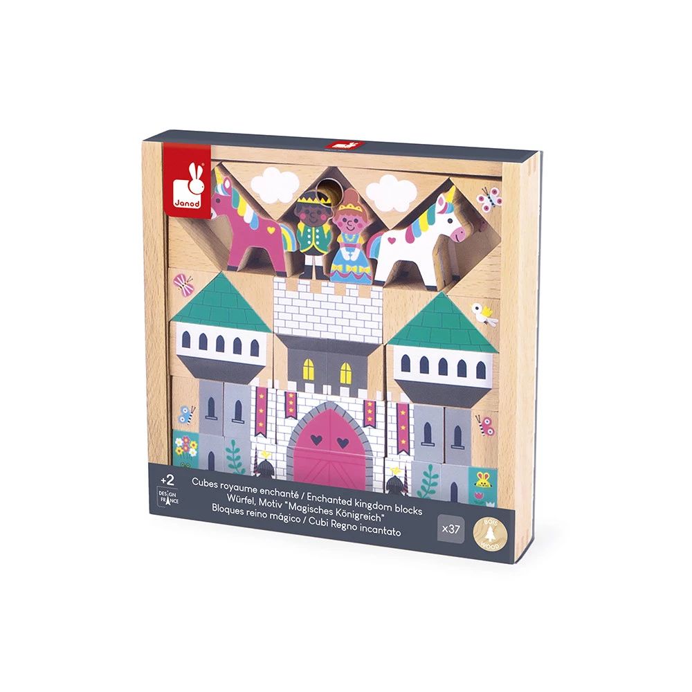 Le coffret de cubes Royaume enchanté de la collection Cross Roads de Janod, un joli coffret de jouets en bois conçu pour éveiller l'imagination des enfants dès 2 ans.