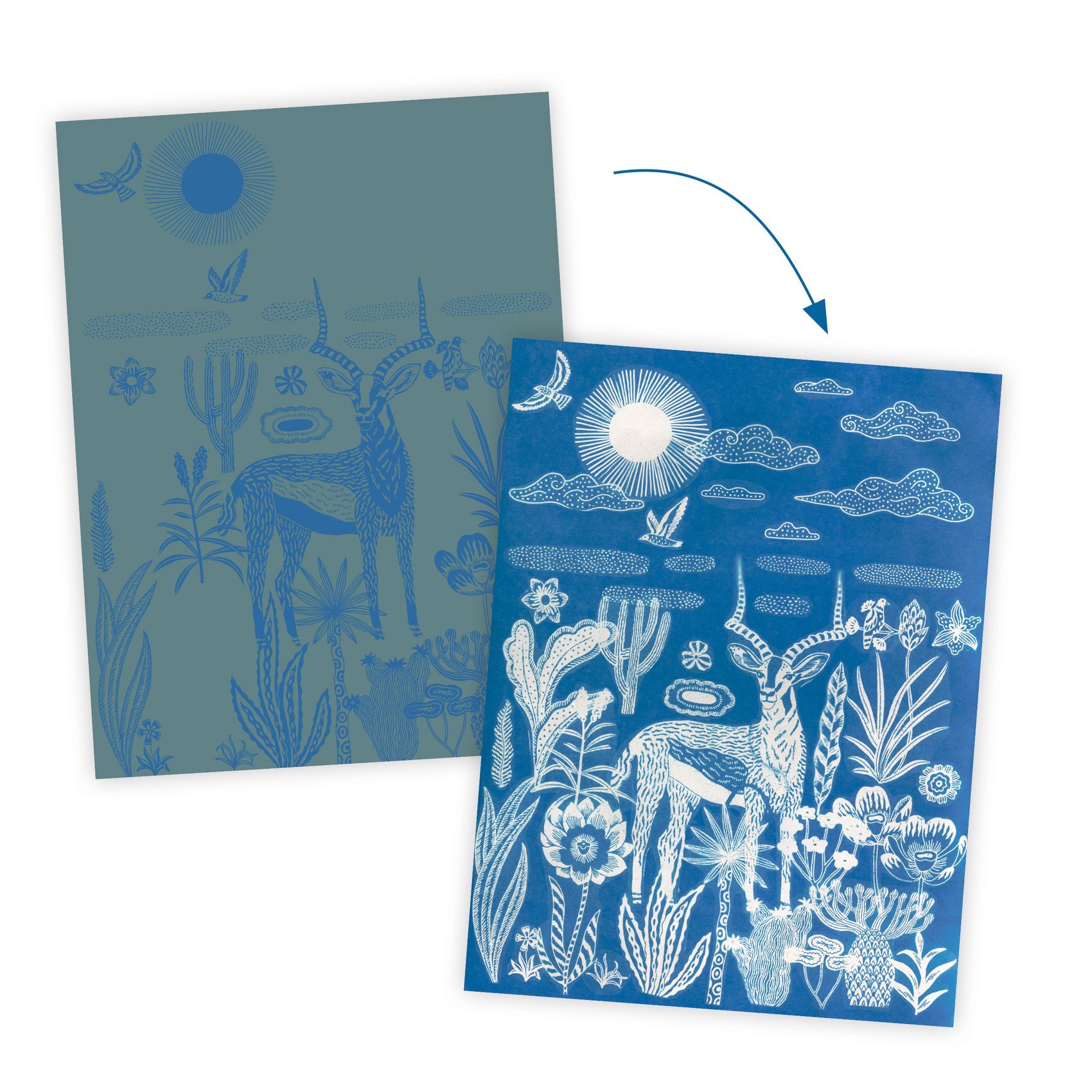 À l'aide de motifs opaques, l'enfant crée des décors sur un papier photosensible. Après une exposition au soleil, le papier est marqué des motifs en négatif. Il n'y a plus qu'à rincer le papier dans un bain d'eau claire et le décor se révèle sur fond bleu !