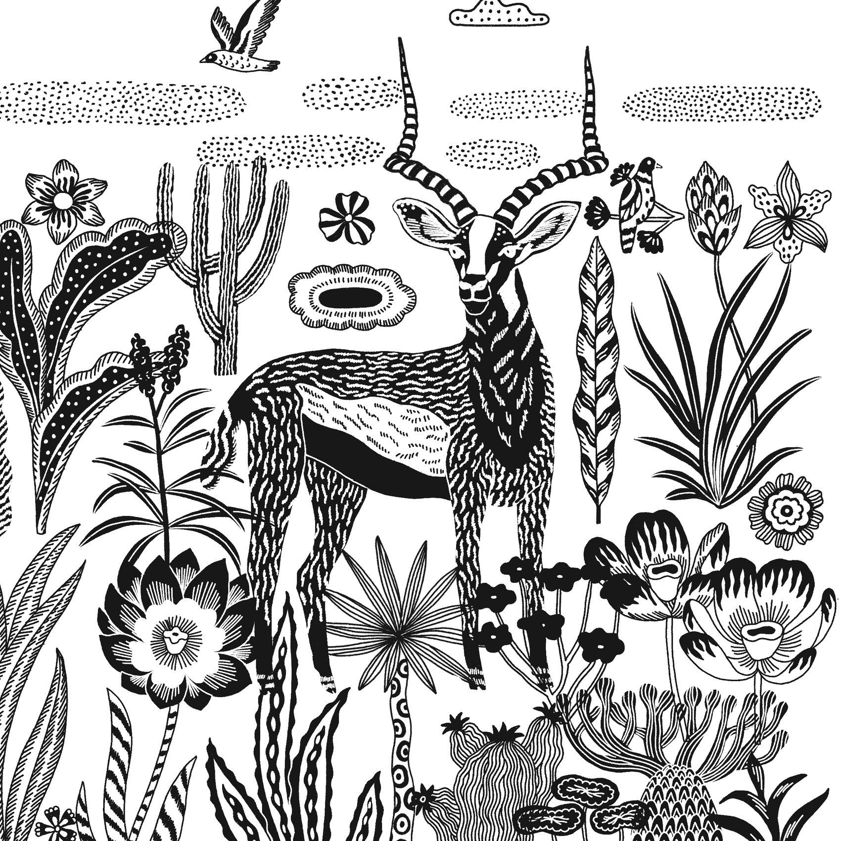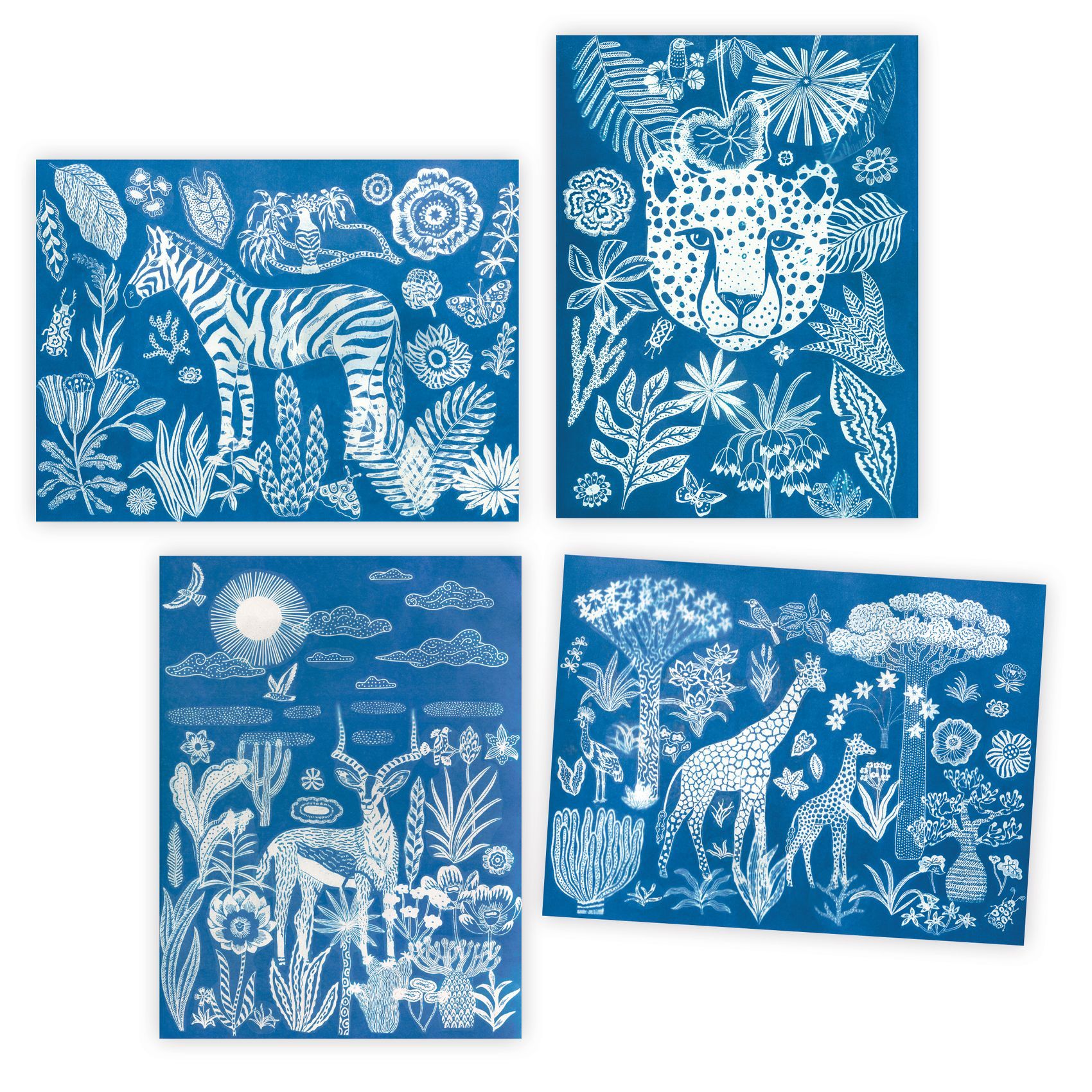 Un kit créatif sur le thème de la savane avec des motifs floraux et végétaux, riches et variés pour créer 4 tableaux nocturnes et poétiques.