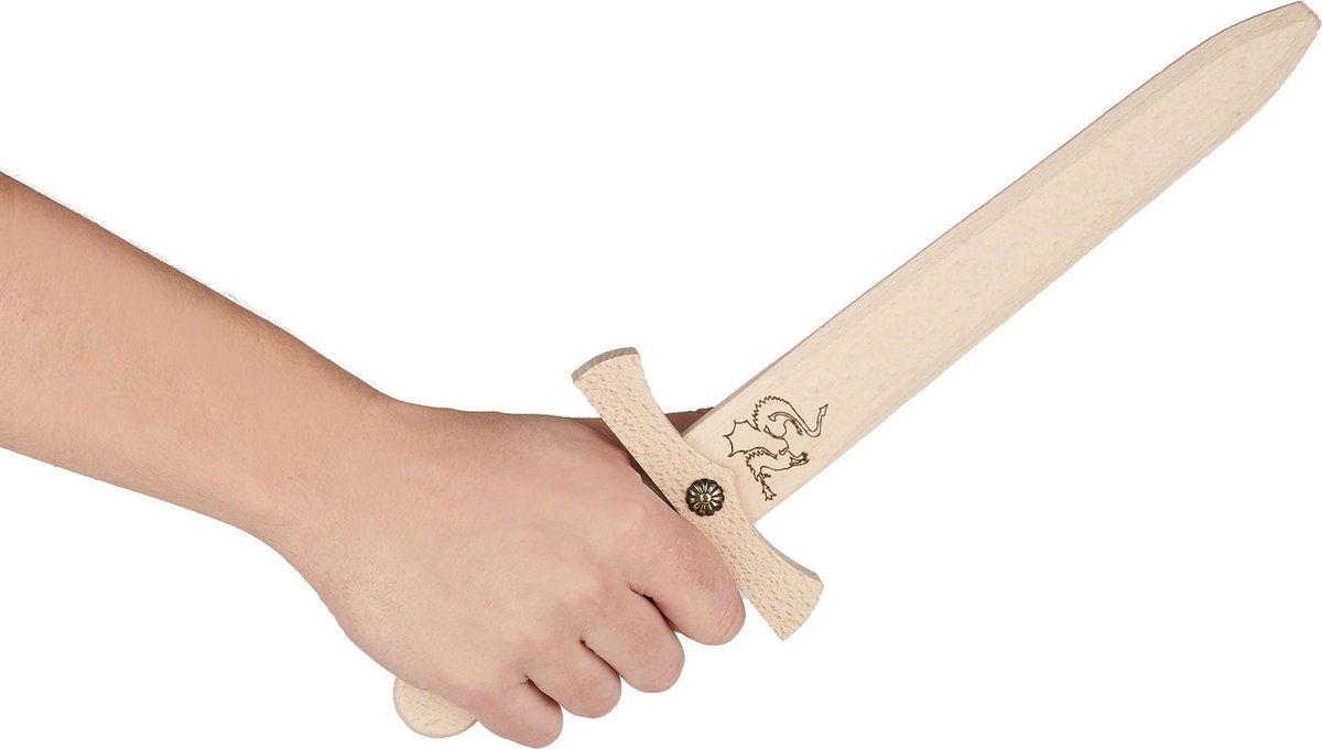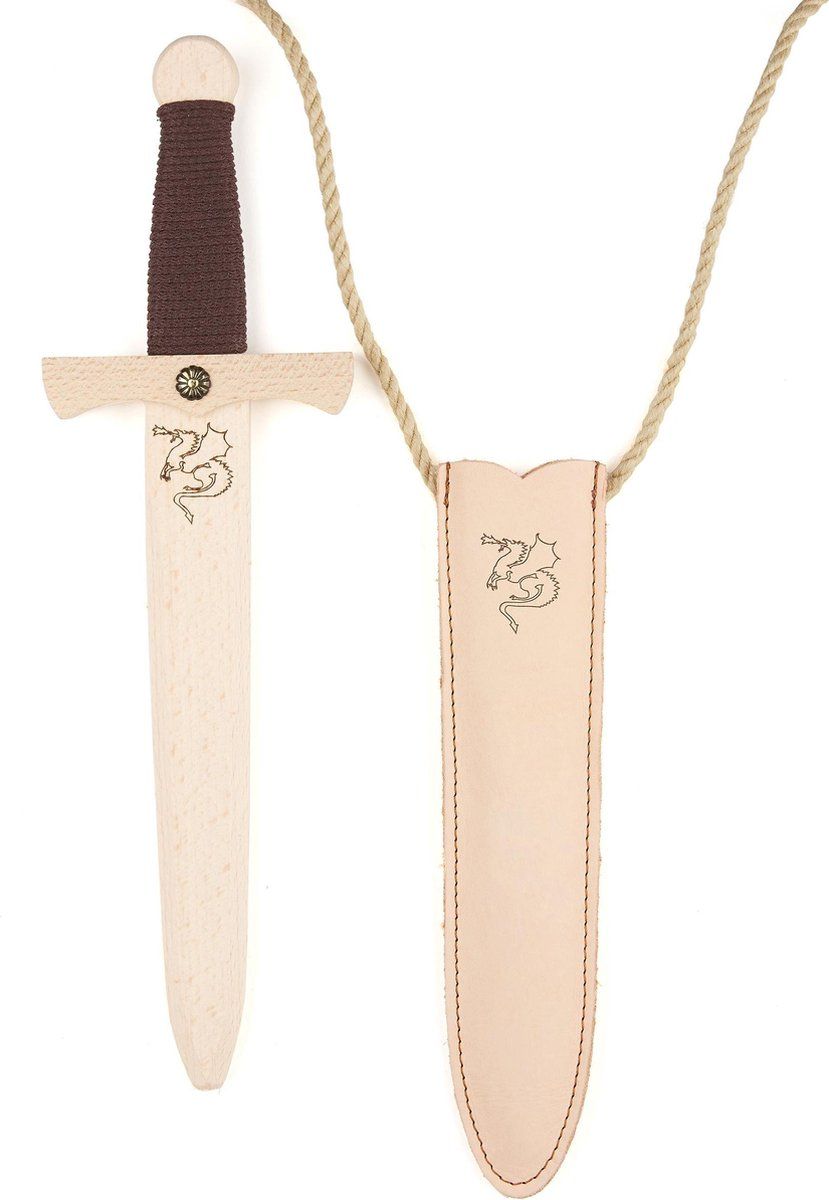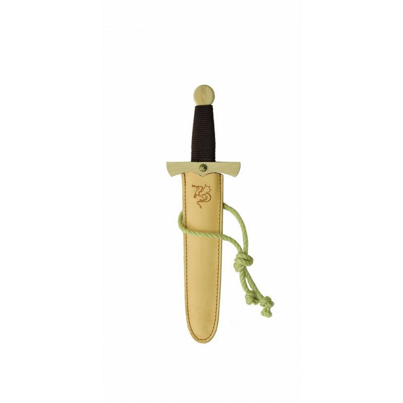 La dague en bois dragon de la marque Allemande VAH possède une poignée enveloppée d'un cordon de coton brun et elle est ornée d'une petite rosace en métal. Elle a des bords arrondis et un nez émoussé pour éviter que les petits chevaliers ne se blessent. La dague est rangée dans un fourreau en cuir et peut s'attacher à la taille grâce a un cordon.