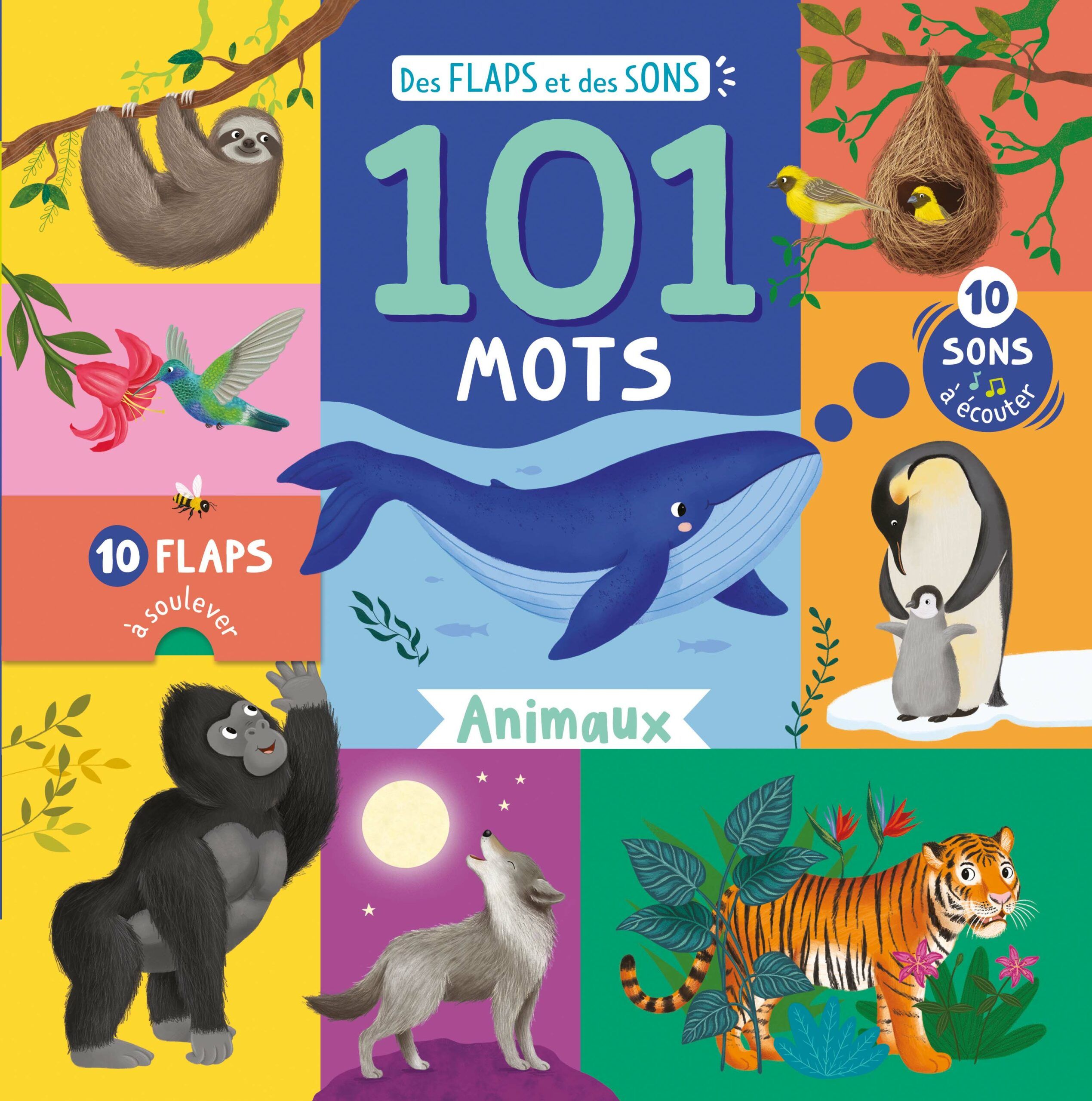 Un livre tout carton avec 101 mots illustrés, 10 puces sonores, des questions et 10 flaps à soulever
