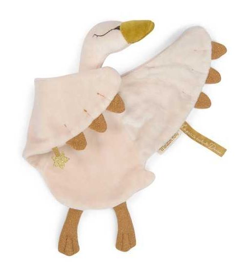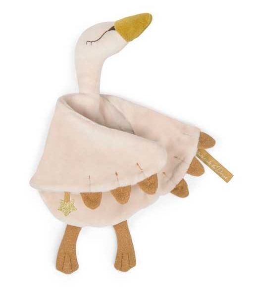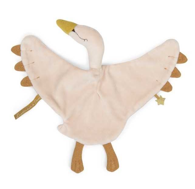 Un doudou cygne au doux visage brodé et bec doré pour accompagner bébé. En éponge velours crème avec des plumes en jersey doré. Plat, il est facile à saisir par les petits mains.