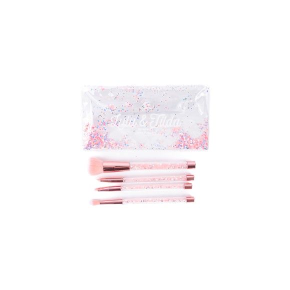 Une trousse de maquillage transparente à paillettes contenant quatre pinceaux éblouissants, chacun orné de cristaux roses flottant dans des manches transparents, de détails roses métallisés et de poils roses doux pour un effet féerique parfait.