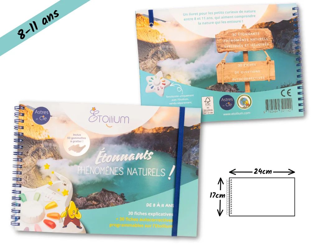Ils s’exercent ensuite en répondant aux questions des 30 fiches autocorrectives incluses. Marées, volcans, mangroves, geysers, éclipses, aurores boréales, tsunamis, tornades et tant d’autres n’auront bientôt plus de secrets pour eux !
