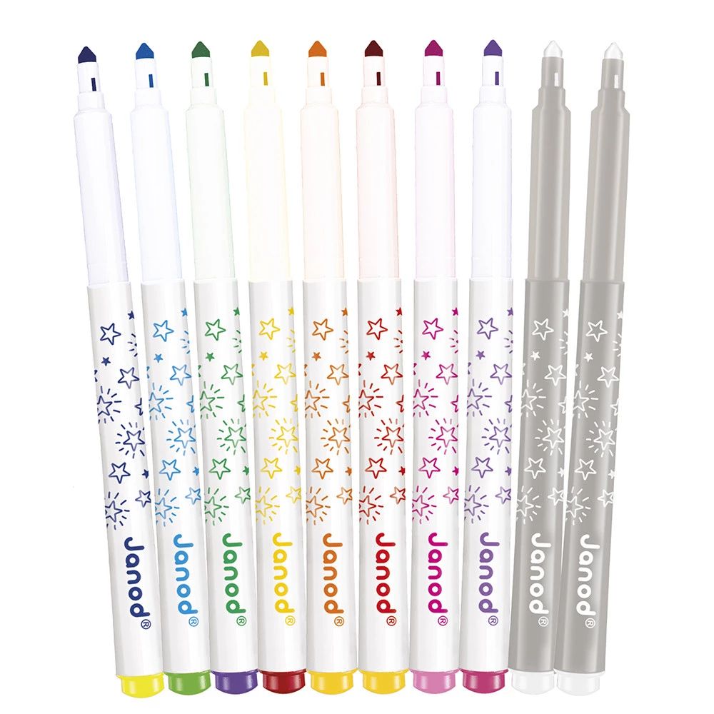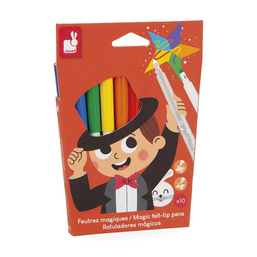 Un set de 10 feutres magiques offrant une palette de couleurs lumineuses, avec une particularité qui va émerveiller les petits ! Votre enfant pourra réaliser ses dessins de manière traditionnelle avec les 8 feutres de couleur. Il pourra ensuite observer l'encre qui change de couleur instantanément au passage du feutre révélateur. Grâce à leur pointe conique, ces marqueurs permettent de colorier avec précision ou en largeur, selon les envies.