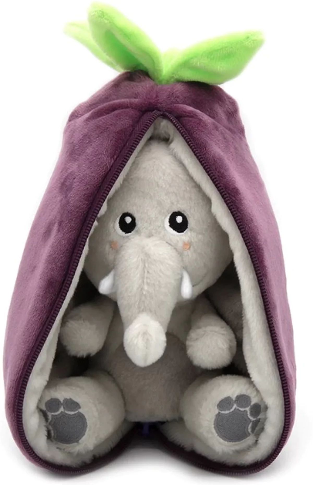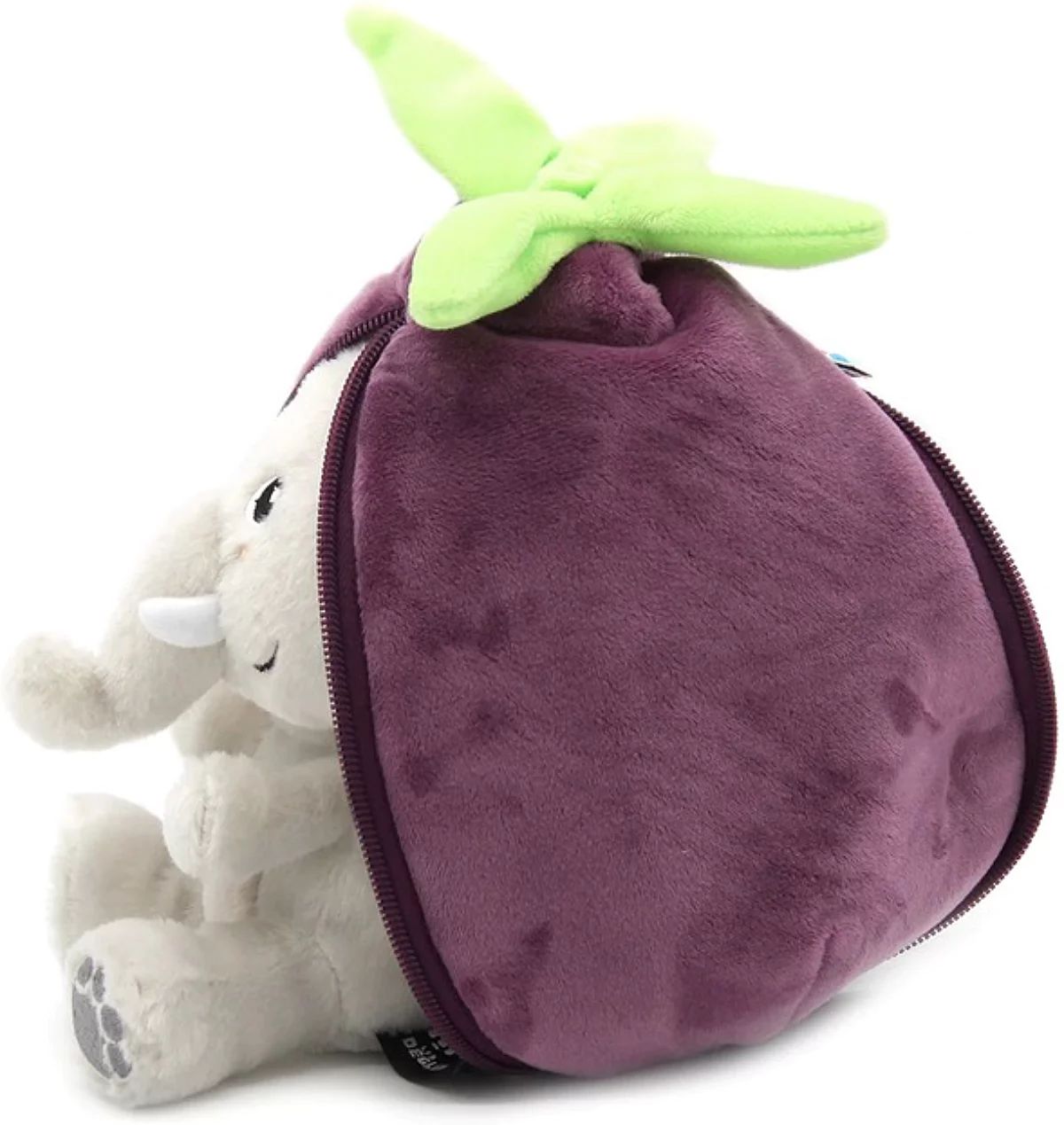 Plongez dans un monde plein de douceur et de fantaisie avec la collection "les Flipetz" par Les Déglingos : La peluche aubergine s'ouvre par une fermeture éclair et se transforme en éléphant tout doux aux immenses oreilles !