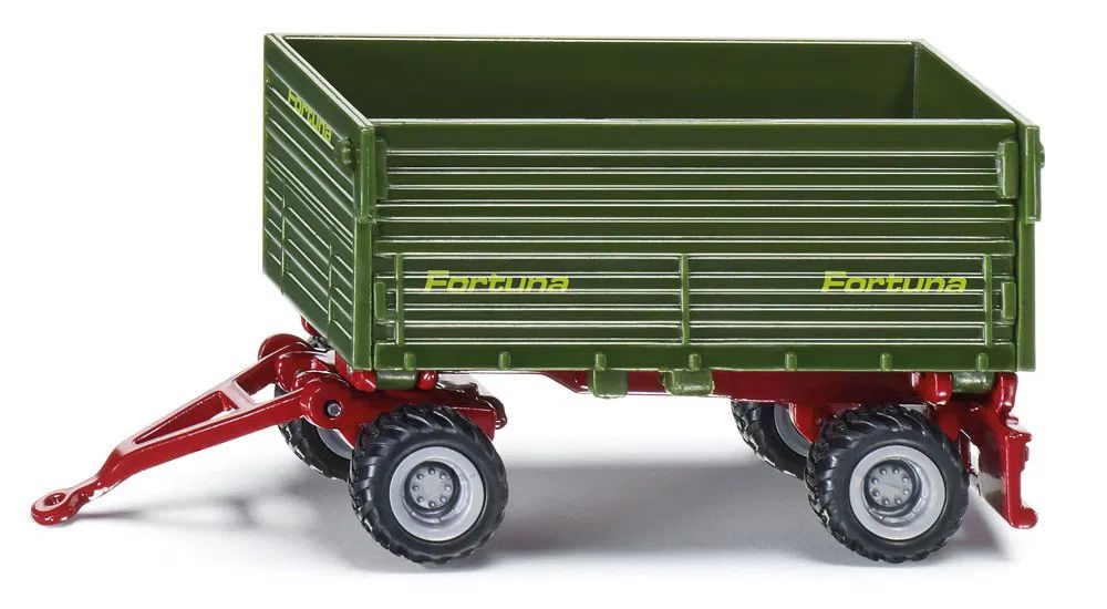 Remorque savoyarde deux essieux de la marque Fortuna. Châssis avec articulation en pivot et timon en métal, carrosserie en matière plastique. La trémie peut être basculée sur un côté et le panneau latéral correspondant peut être ouvert.
