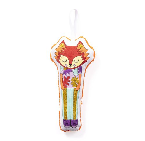 1 renard en coton imprimé de 24 cm - 1 pinceau - 6 flacons de peinture - 1 tube de paillettes